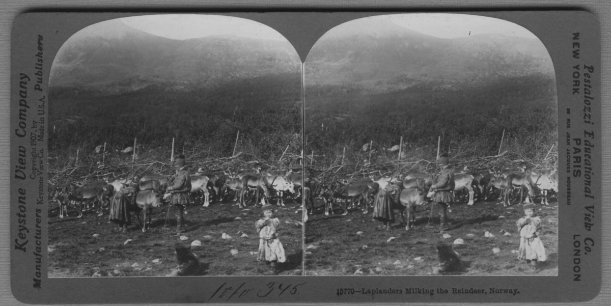 'Samer mjölkar renar, 1 kvinna, 1 man och 1 barn. :: ''15770 - Laplanders milking the reindeer, Norway.'' :: :: Ingår i serie med fotonr. 315-422.'