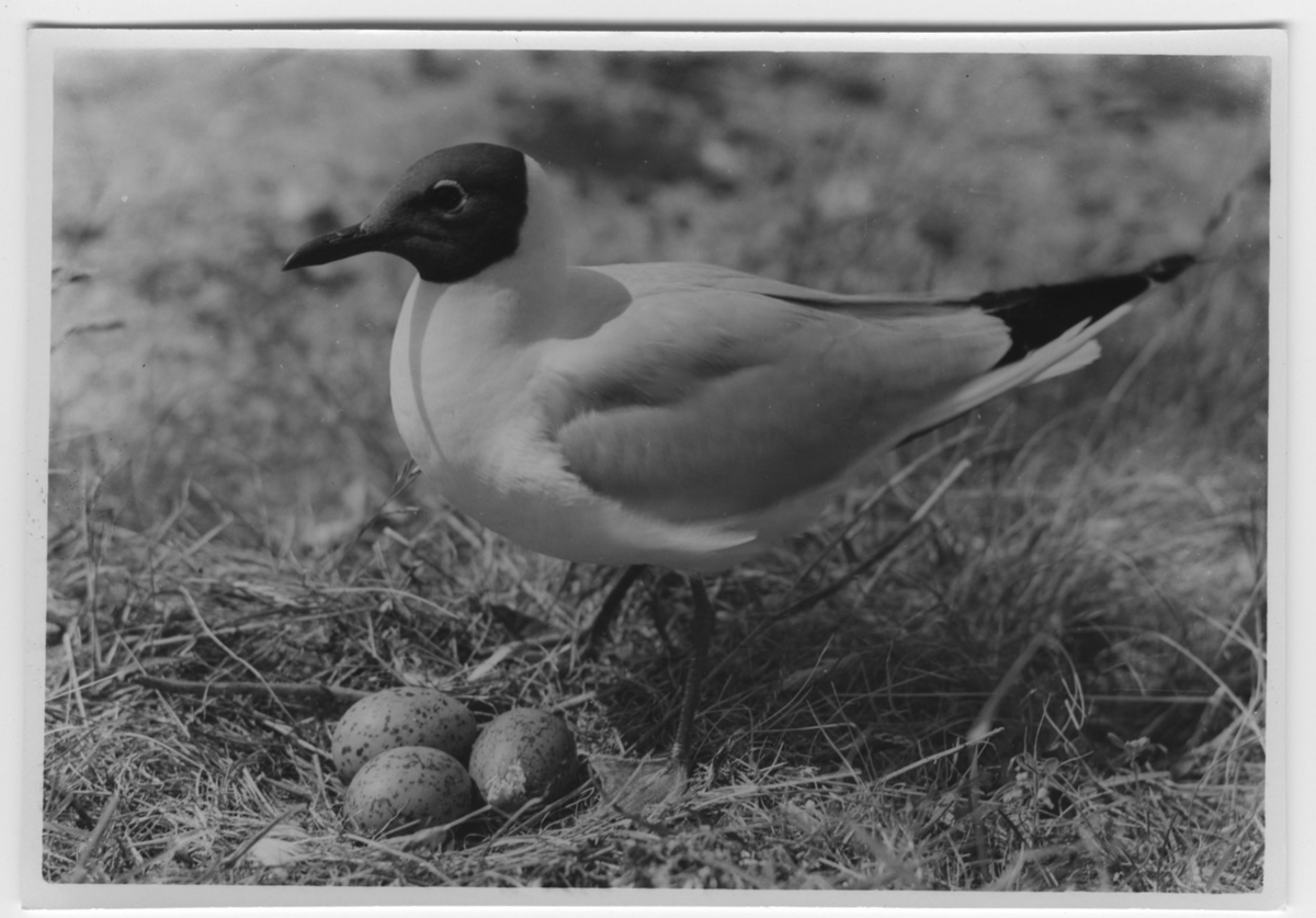 'Skrattmås, stående vid boet med 3 ägg, närbild. :: :: Ingår i serie med fotonr. 3478-3480.'