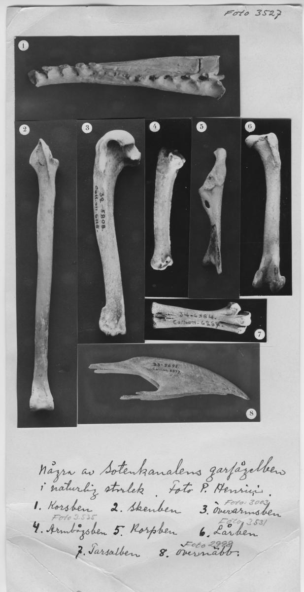 'Sammanställning av 8 st garfågelben från Sotenkanalen. :: Numrerade uppifrån och ned, vänster till höger: :: 1) Korsben :: 2) skenben :: 3) Överarmsben (Coll.an. 6115) :: 4) Armbågsben :: 5) Korpben :: 6) Lårben (Coll.an. 6266) :: 7) Tarsalben (Coll.an. 6267) (Bilden med i Göteborgs Naturhistoriska Museums Årstryck 1935 s. 9) :: 8) Övernäbb (Coll.an. 6967) :: :: Bl.a.: :: Gen.kat.nr. 1933-5895 Coll.an. 6077? :: Gen.kat.nr. 1934-6384 Coll.an. 6267 :: Gen.kat.nr. 1932-5808 Coll.an. 6115 :: :: Se serie med fotonr. 3527-3536.'