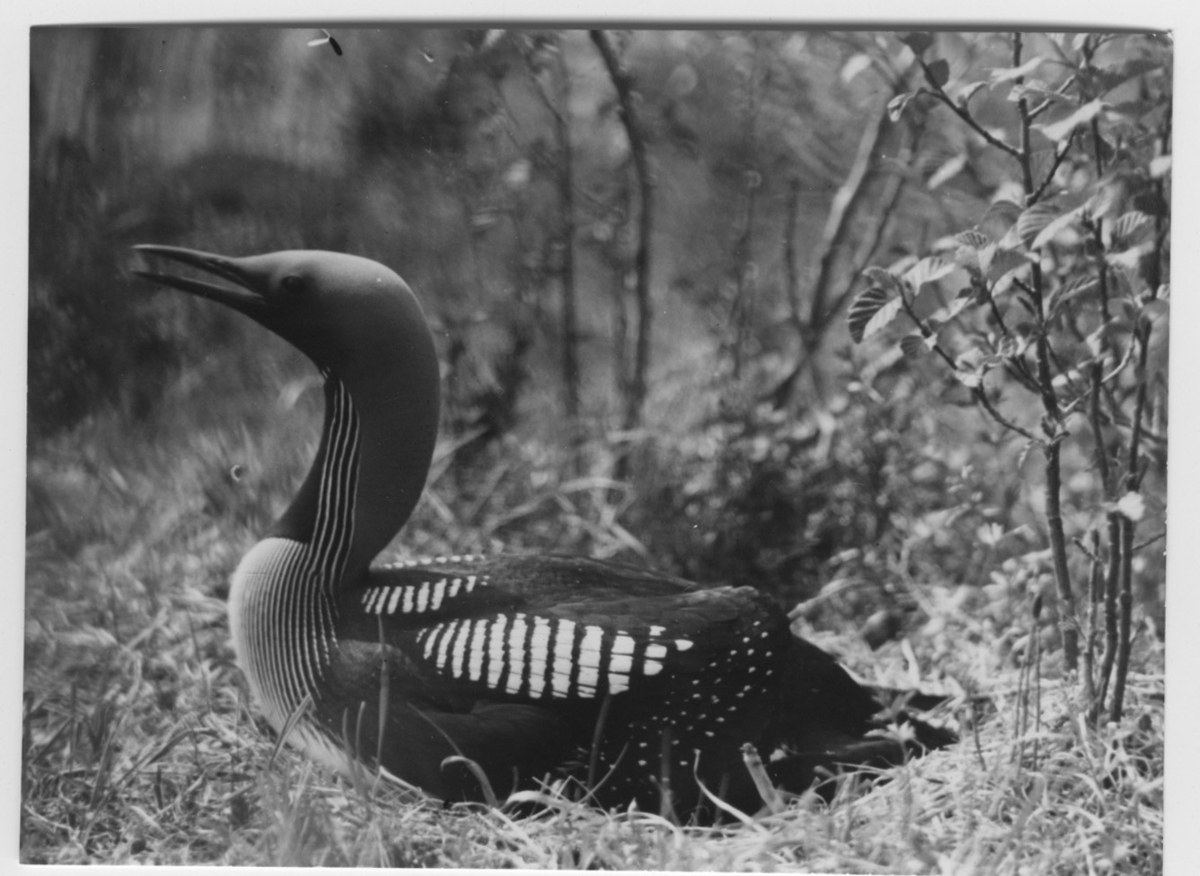'Enligt foto: ''Storlommen ruvar.'' 1 stormlom i närbild på boet vid buske. :: :: Ingår i serie med fotonr. 3550-3567. Se särskilt fotonr. 3551-3554.'