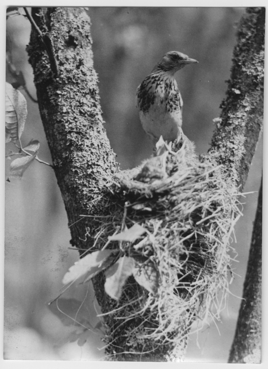 'Björktrast vid boet med ungar, i trädklyka. Lavklädd trädstam. :: :: Ingår i serie med fotonr. 3550-3567. Se särskilt fotonr. 3562-3564.'