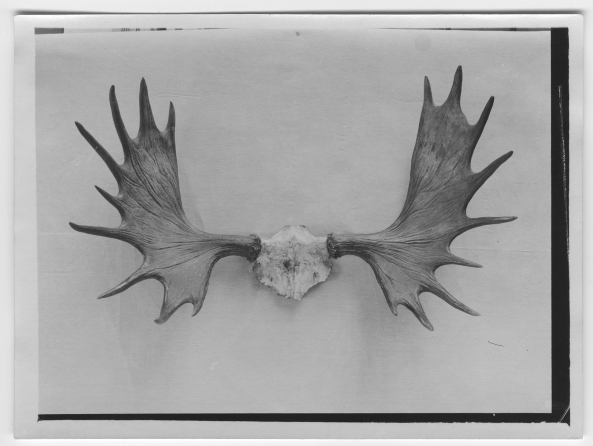 'Älgkrona, största bredd 111 cm, 9+9 spetsar. :: Vidd: 111 cm :: höger horn 64 cm :: vänster horn 69 cm :: Fynddatum: 1933.'