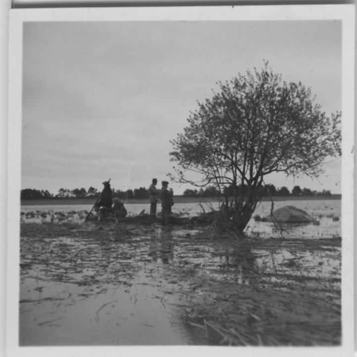 'Biologiska föreningens utfärd till Tåkern, Vadstena m.fl. platser: :: :: Vy med 4 män ute i sjön stående på landbit med 1 ett träd. Vy med vass liggande i sjön. :: :: Se fotonr. 3588-3634 samt 3661-3677.'
