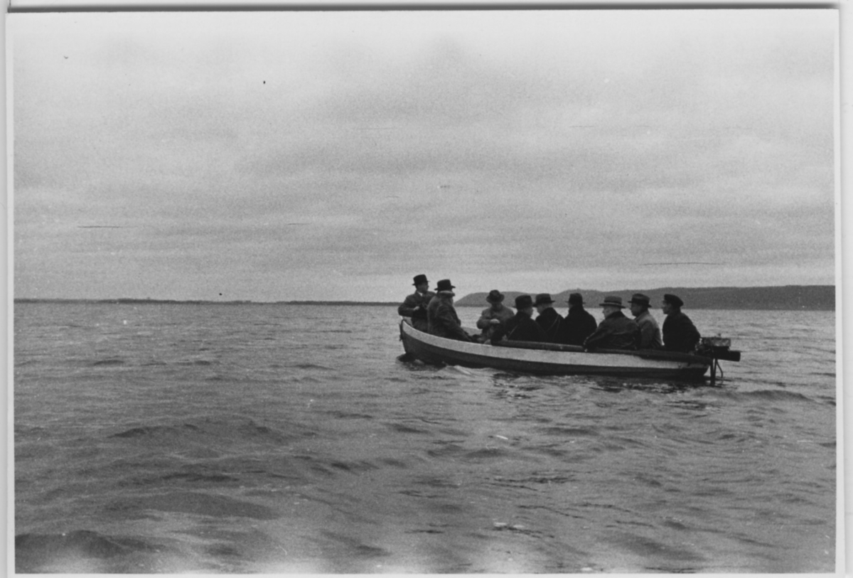 'Biologiska föreningens utfärd till Tåkern, Vadstena m.fl. platser: :: :: Gruppen ute på öppet vattnet i båt. 10 män i en eka på sjön. :: :: Se fotonr. 3588-3634 samt 3661-3677.'
