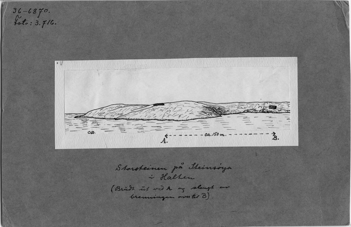 'Flyttblocket på Steinsöya i Halten. Teckning av Carl Dons över hur blocket förflyttats? :: :: Ingår i serie med fotonr. 3694-3719 se även fotonr. 3679-3693.'