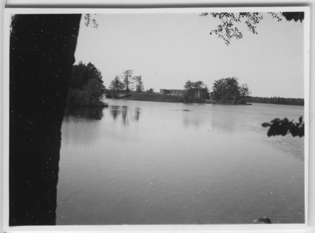 'Biologiska föreningens utfärd till Växjö, Aneboda och Misterhult: :: :: Vy över Kronobergs slottsruin, med sjön runtom. :: :: Se 3902-3908, 3909-3923 samt 3924-3933 från samma utfärd.'