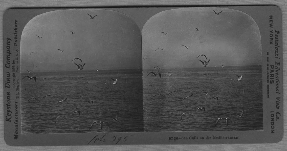 'Vy med måsar över havsyta. :: :: ''9720 - Sea Gulls on the Mediterranean.'' :: :: Ingår i serie med fotonr. 315-422.'