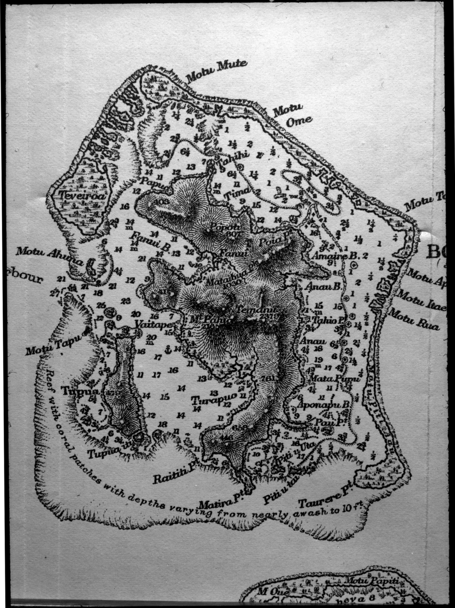 Bora Bora, Korallö i Sällskapsöarna. Kartbild. Ev. avfotografering av bild i bok.