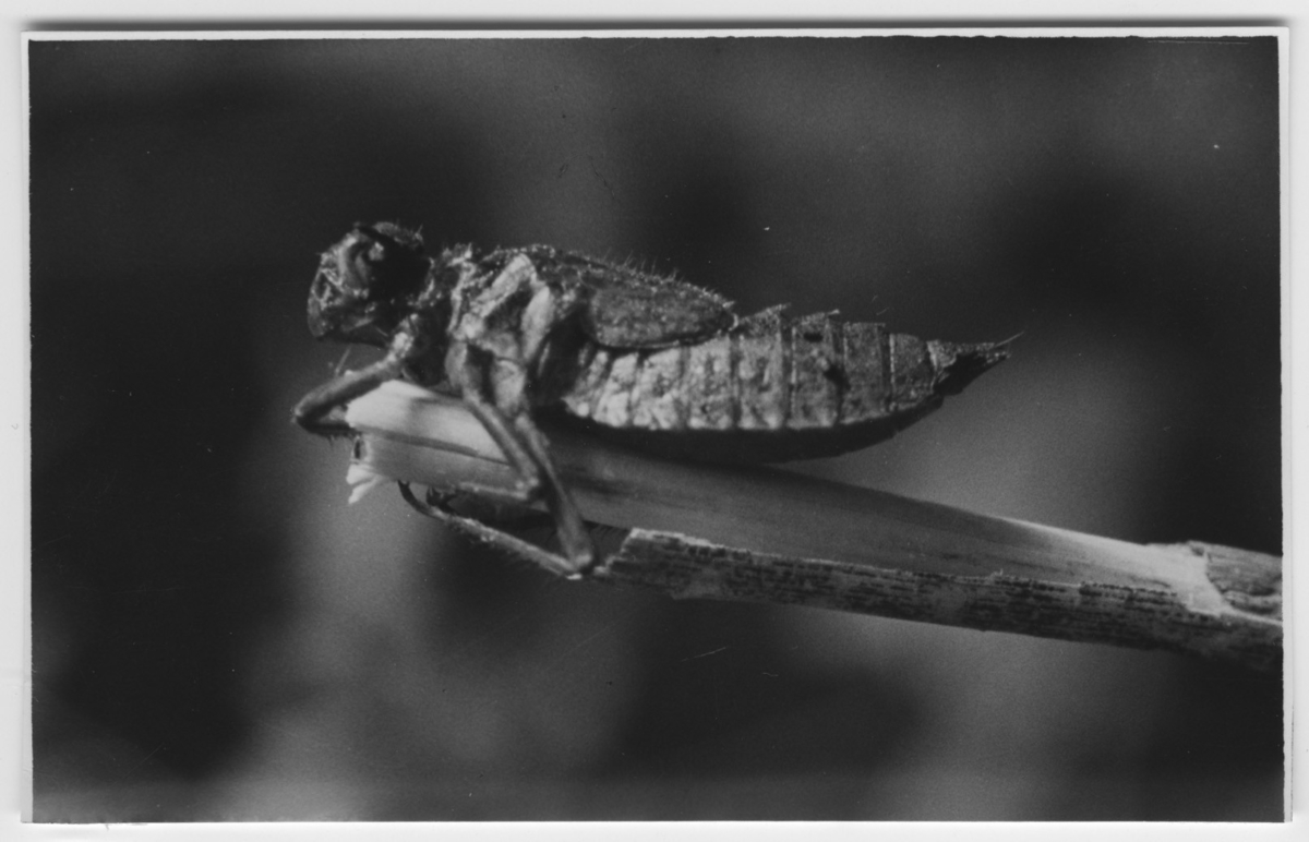 Ingår i bildserie med fotonr. 4051:1-9 på när sländan sittande på gren kommer ut ur sista larvhuden.