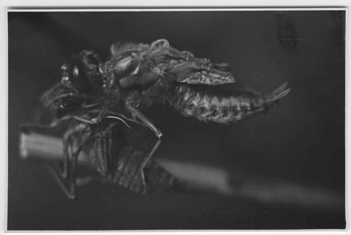 Ingår i bildserie med fotonr. 4051:1-9 på när sländan sittande på gren kommer ut ur sista larvhuden.