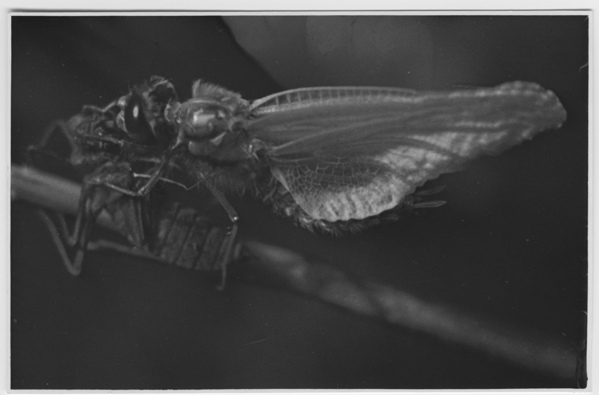 Ingår i bildserie med fotonr. 4051:1-9 på när sländan sittande på gren kommer ut ur sista larvhuden.