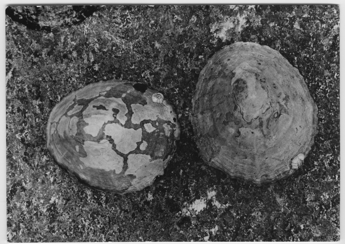 '2 st skålsnäckor. Närbild, sedda ovanifrån. :: :: Ingår i serie med fotonr. 4060-4064.'