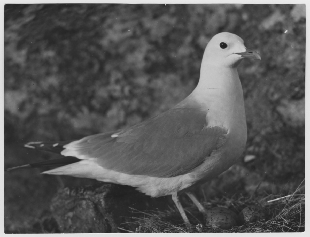 Fiskmås stående på bo med ägg. 2 ägg syndliga, fågel sedd från sidan.
