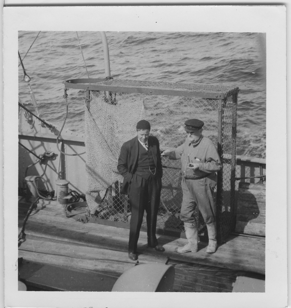 '''Skageraks''expedition 6-10 juni 1939: :: :: Orvar Nybelin och Leonard Axel Jägerskiöld (till höger) intill ''hönsburen'' (korallskrapan) på båtdäck, fördäck. Stövlar. Pipa. Skärmmössa. Keps. :: :: Ingår i serie fotonr. 4100:1-10.'