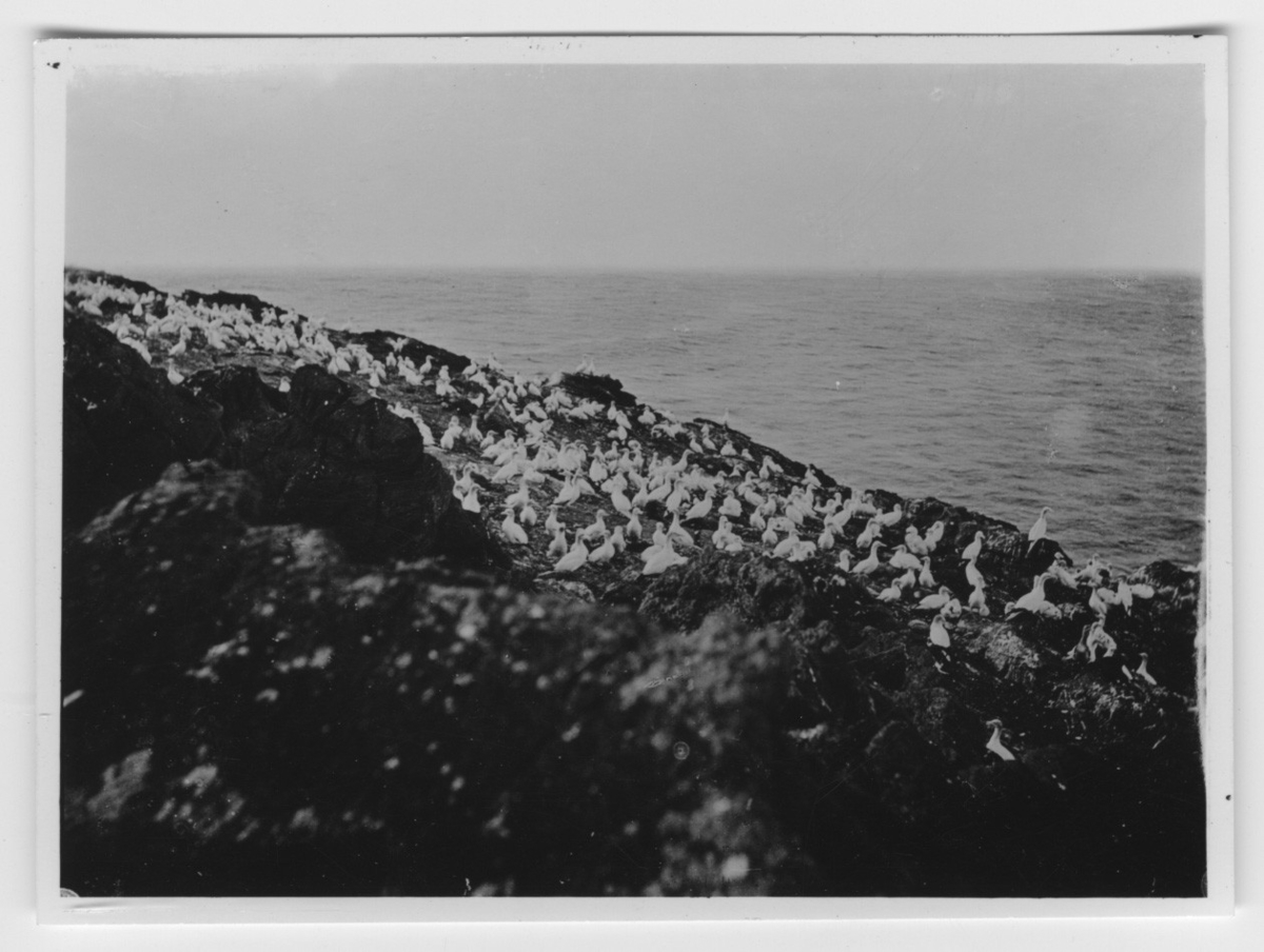 Del av havssulesamhället på Vetmannaöarna. Vy med hav och bergsluttning.
