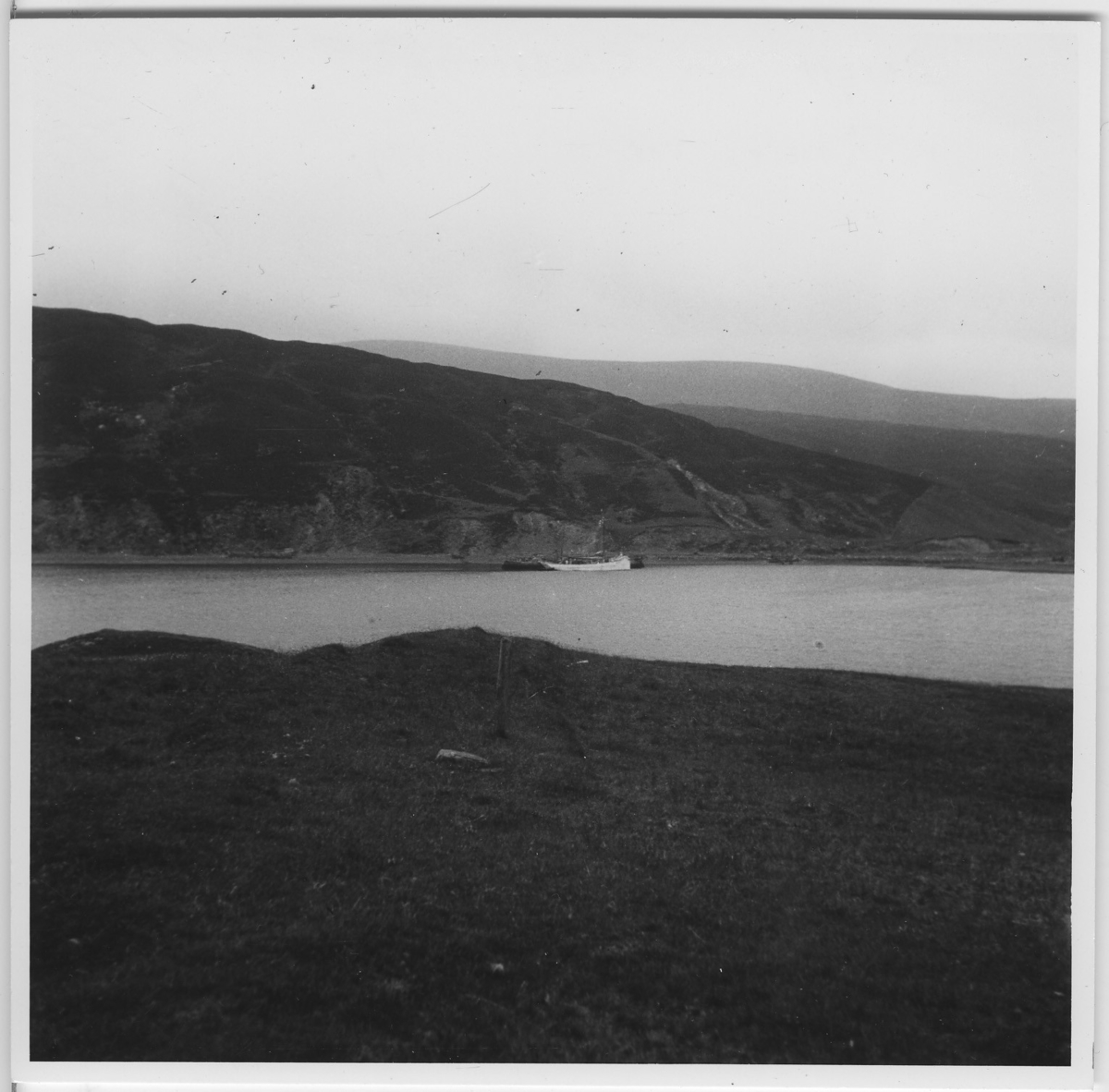 'Från ''Skageraks''-expeditionen till Hebriderna och Shetland: :: :: Bergit (båt) och Gladstone (båt) i Ronnies Voe (förstorad version av foto nr 4113:59). :: :: Ingår i serie med fotonr. 4113:1-82.'