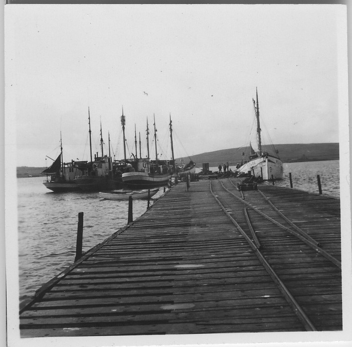 'Från ''Skageraks''-expeditionen till Hebriderna och Shetland: :: :: Bryggan vid Balta sound: Svenska båtar söndagsvilande i Balta Sound (förminskad version av foto nr 4113:60). Männsikor på bryggan. :: :: Ingår i serie med fotonr. 4113:1-82.'