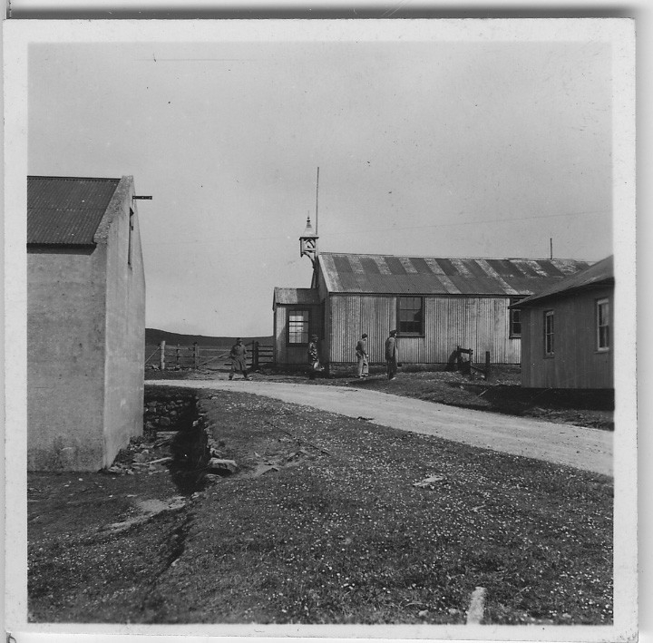 'Från ''Skageraks''-expeditionen till Hebriderna och Shetland: :: :: 4 människor gående utanför Svenska kapellet i Balta sound (byggt år 1910). Ytterligare 2 byggnader, (förstorad version av foto nr 4113: 65). Grusväg. :: :: Ingår i serie med fotonr. 4113:1-82.'