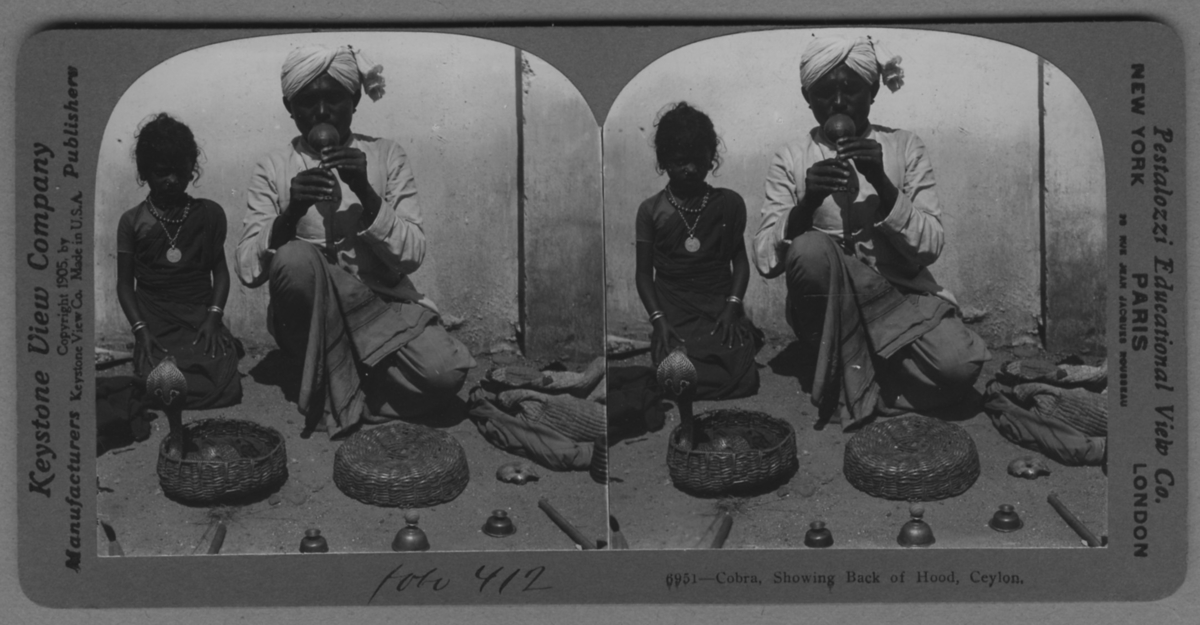 'En manlig ormtjusare med en upprest kobra i en korg. En flicka sitter bredvid. :: :: ''6951 - Cobra, showing back of hood, Ceylon.'' :: :: Ingår i serie med fotonr. 315-422. Se särskilt fotonr. 412-414.'
