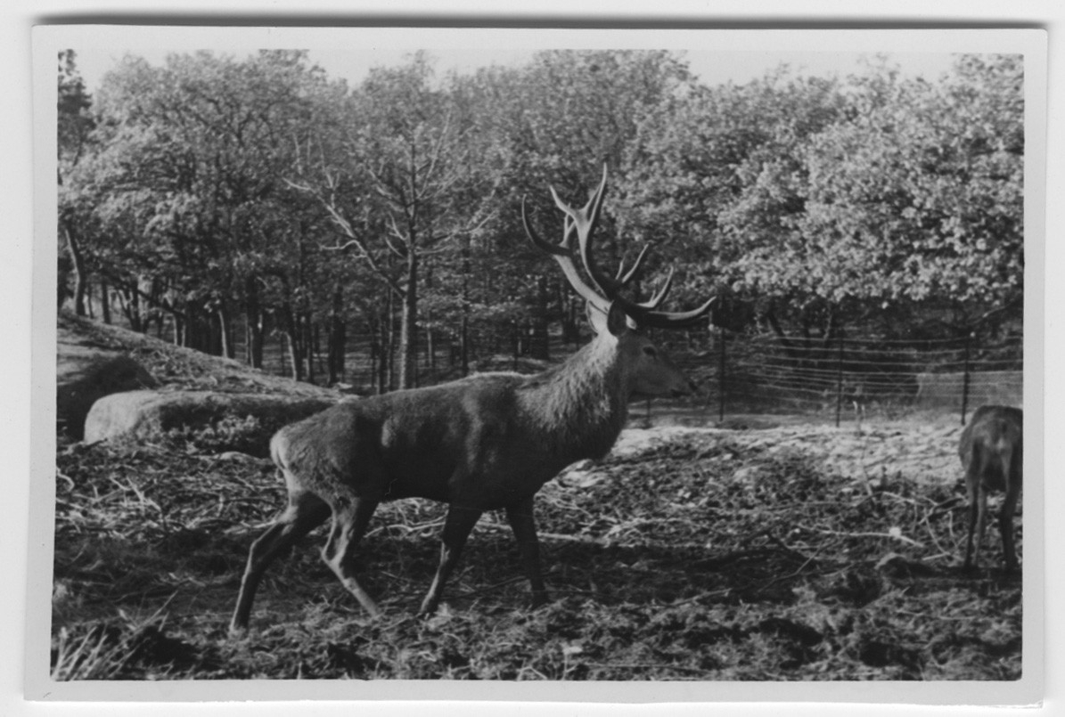'2 kronhjortar, varav 1 tjur sedd från sidan, helbild. Hane. :: :: Ingår i serie med fotonr. 4159:1-7 samt 4160:1-5.'