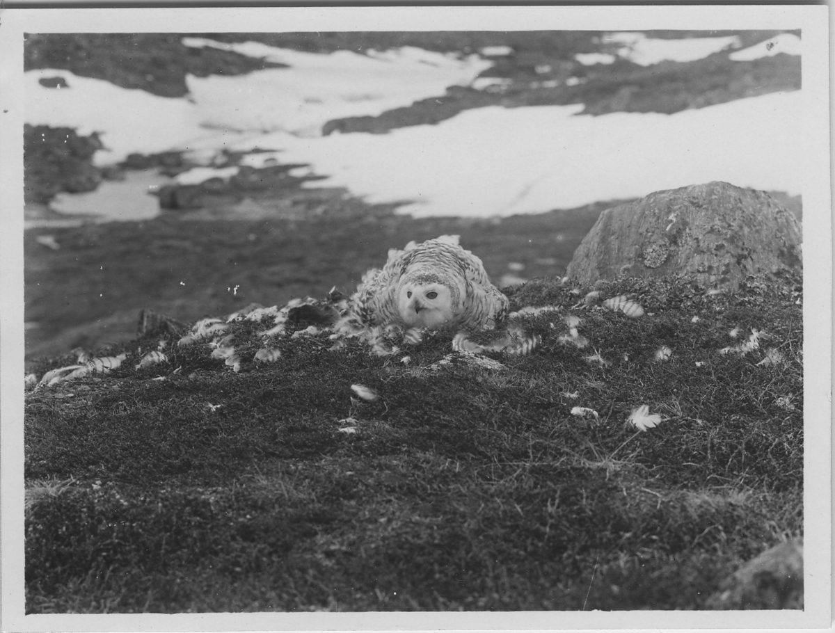 'Fjälluggla ligger på boet intill stenblock. Fjädrar på marken. Delvis snötäckt mark i bakgrunden. :: :: Ingår i serie med fotonr. 4169:1-13. :: :: Ingår i seie med fotonr. 4167-4175.'