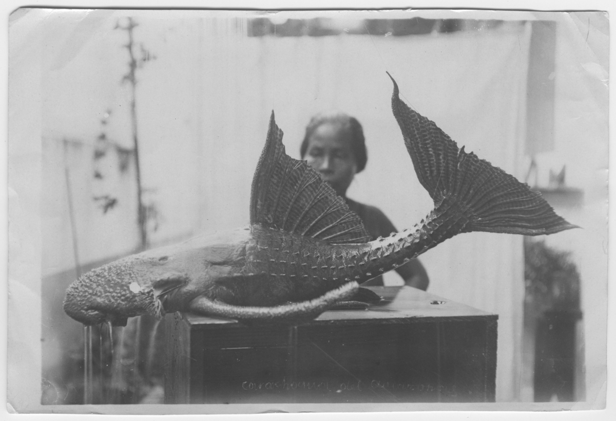 Liggande med fenor utfällda, på en låda. 1 person stående bakom lådan.