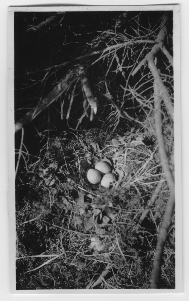 'Morkulla, bo med 3 ägg, under en gran i Kvarnbacken. :: :: Ingår i serie med fotonr. 4221-4224.'