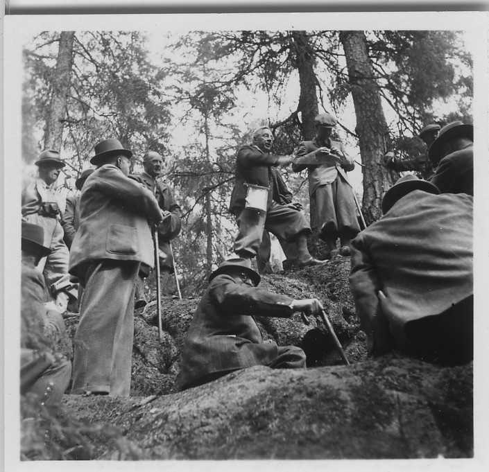 'Biologiska föreningens utfärd till Sveafallen och Villingsbergs kronopark. :: :: Gruppen på ca 10 män samlade på en berghäll med omgivande granar, 1 man talar för dem. Möjligen Leonard Axel Jägerskiöld sittande med hatt, glasögon och käpp. :: :: Se fotonr. 4226:1-34, 4228:1-3 och 4229:1-3 från samma utfärd.'