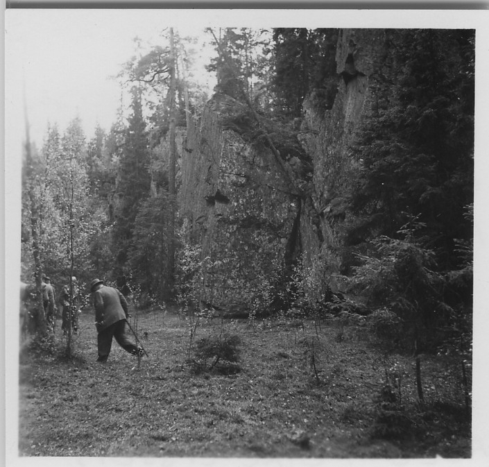 'Biologiska föreningens utfärd till Sveafallen och Villingsbergs kronopark. :: :: Del av gruppen synlig, några män, med granar växande invid bergvägg. Fotograferat från avstånd. :: :: Se fotonr. 4226:1-34, 4228:1-3 och 4229:1-3 från samma utfärd.'