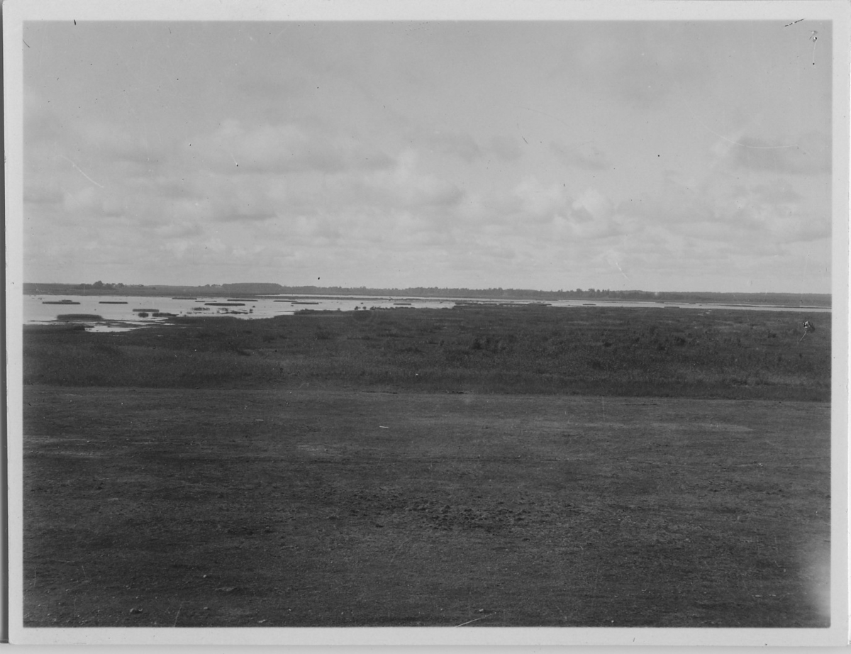 'Bilder från Hornborgasjön från: R. Söderberg: '' Hornborgasjön och dess fornsjöområde'' Del I 1932. :: :: Landskapsvy med sjön i bakgruden. Sjösänkning. :: :: Ingår i serie med fotonr. 4245:1-35.'