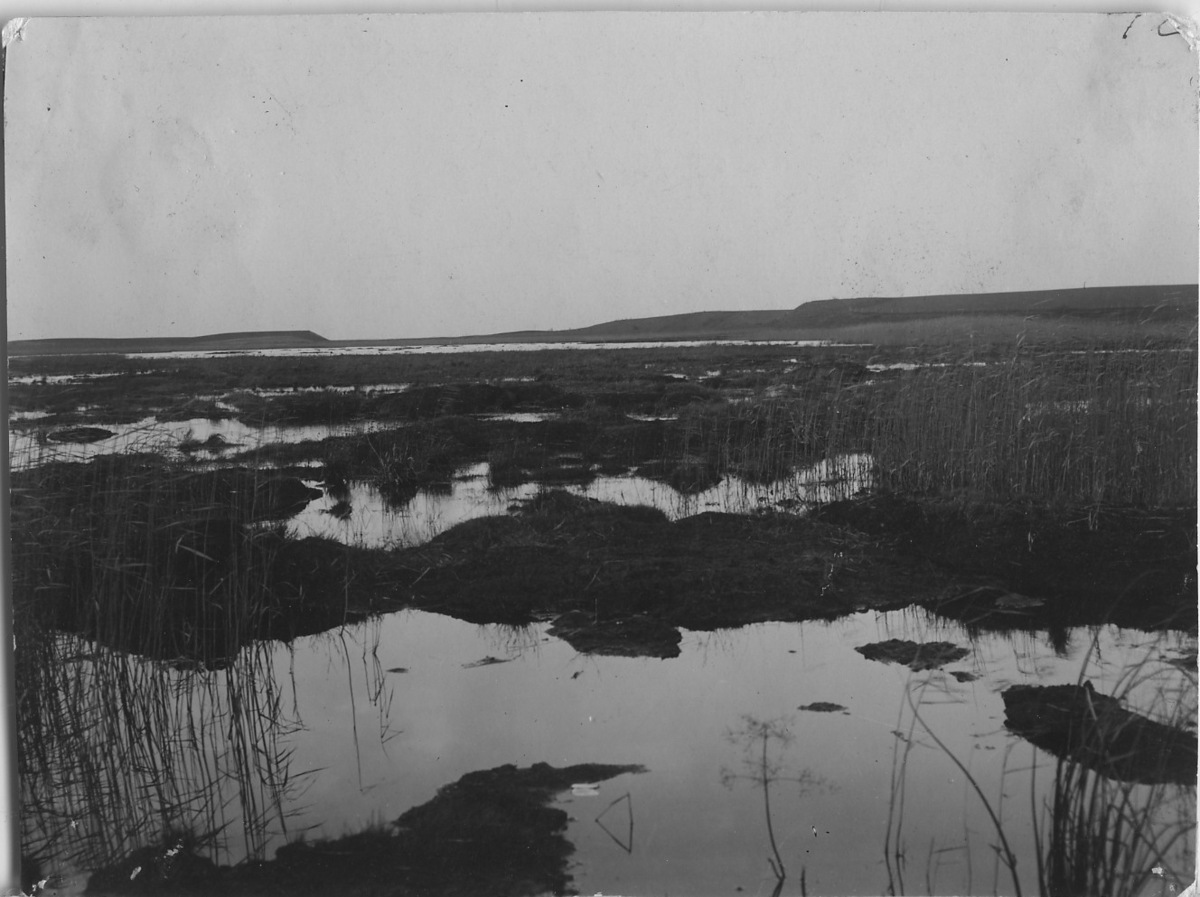 'Bilder från Hornborgasjön från: R. Söderberg: '' Hornborgasjön och dess fornsjöområde'' Del I 1932. :: :: Hornborgaviken efter sänkningen, ett marskland har bildats genom erosion i torvlagret. Sjösänkning. :: :: Ingår i serie med fotonr. 4245:1-35.'
