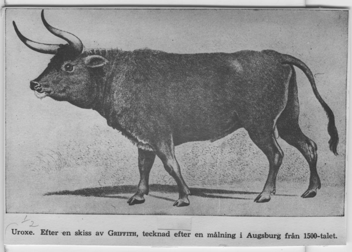 Uroxe. Efter en skiss av Griffith, tecknad efter en målning i Augsburg från 1500-talet. Tidningsurklipp med text.