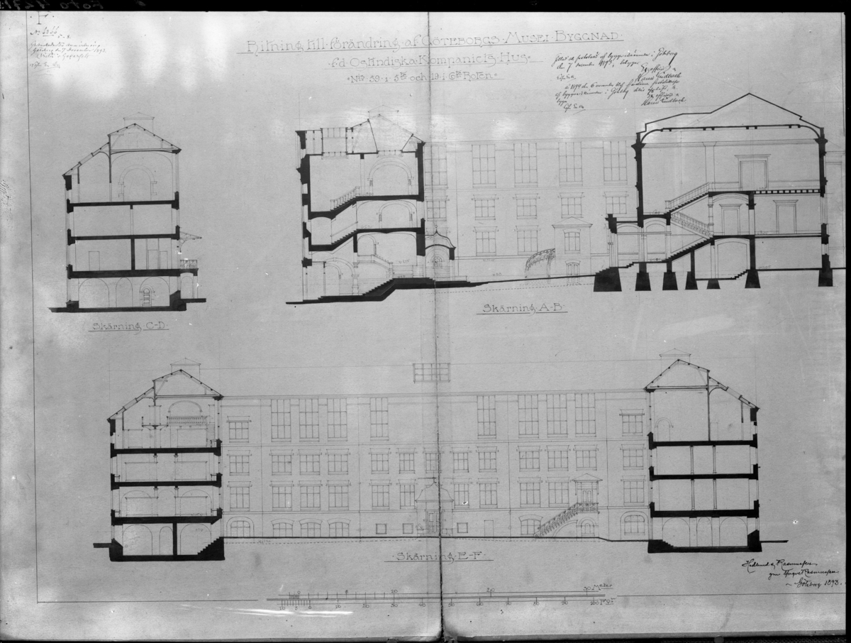 'Ritningar till nytt Naturhistoriskt Museum. Ritningarna avfotograferade mot vägg. (1893). :: :: ''F. Ritning till förändring af Göteborgs Musei Byggnad f.d. Ostindiska Kompaniets Hus''. :: :: Ingår i serie med fotonr. 4271:1-24.'