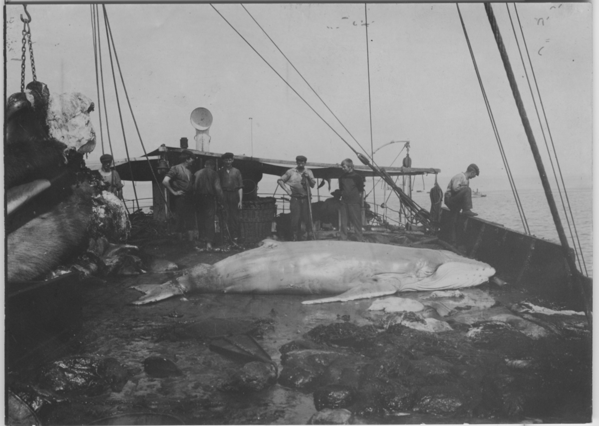 'Knölval iggande på båtdäck. Troligen foster av knölval. 7 män står på däck vid valen. :: :: Ingår i serie med fotonr. 4284:1-3.'