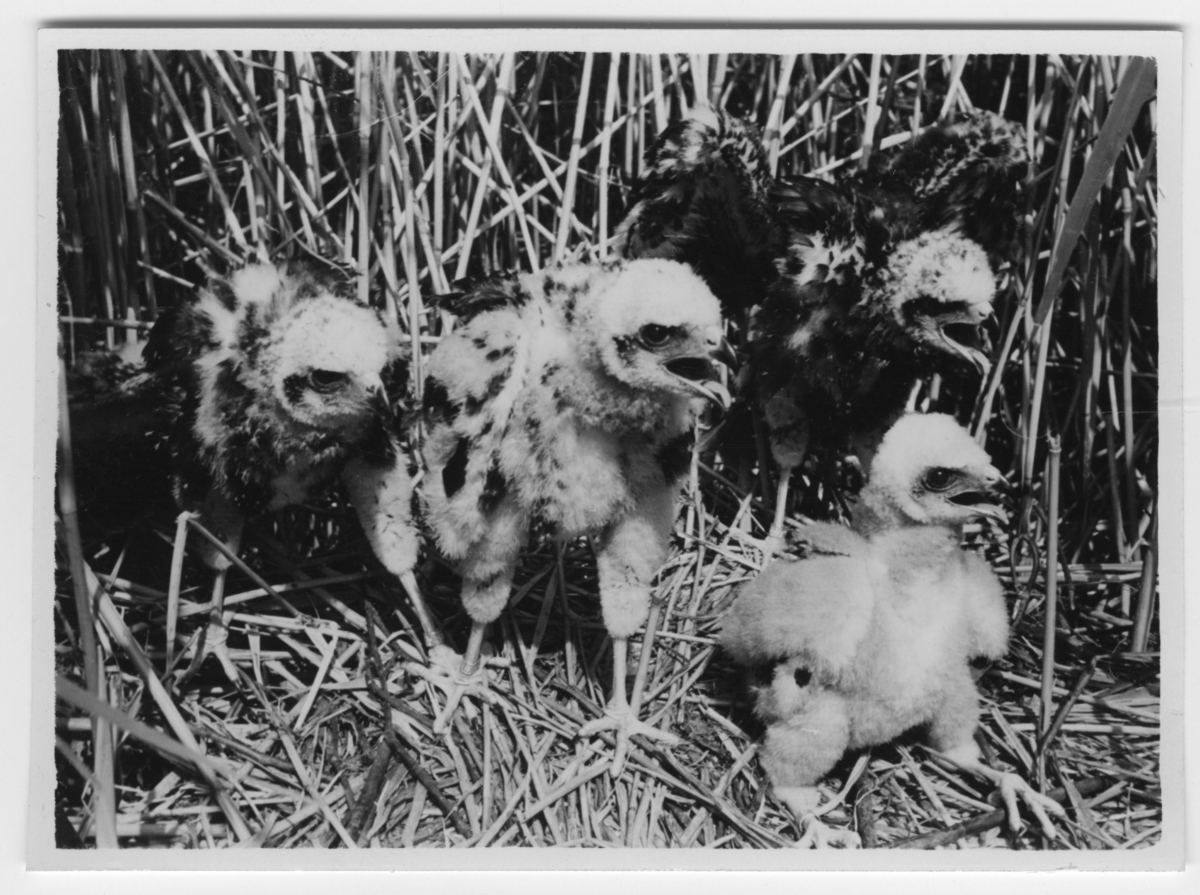 4 skrikande ungar av brun kärrhök i boet, närbild. 1 unge har vingarna lyfta. I vass.