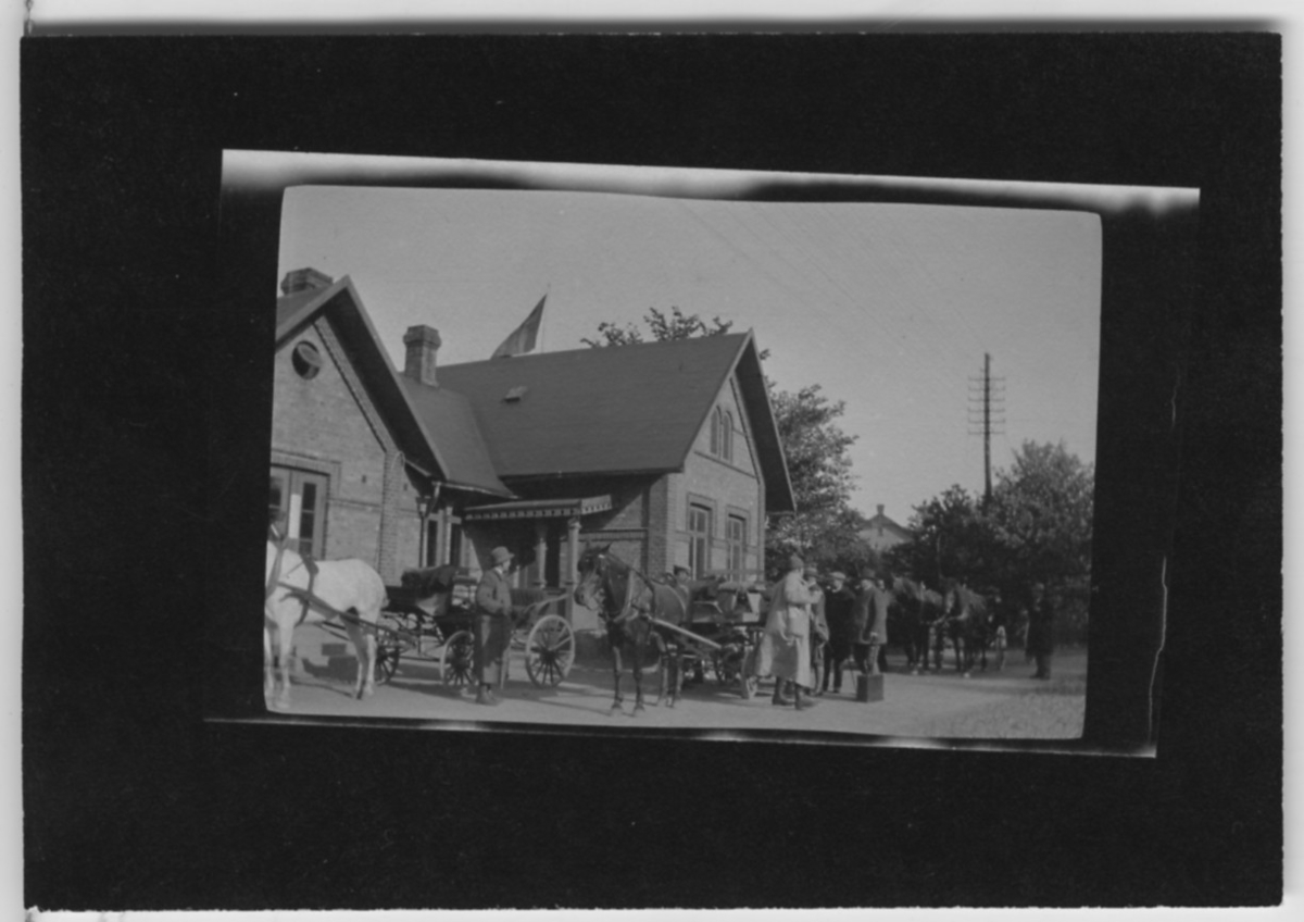 'Biologiska föreningens utfärd till Hallands Väderö: :: :: Med färd i häst och vagn framför stationen i Grevie. 3 vagnar uppställda framför byggnad. Tiotal hattklädda män synliga vid vagnarna. Droska. Framför ett hus. :: :: Se fotonr. 1464 och 4311:1-58 från samma utfärd.'