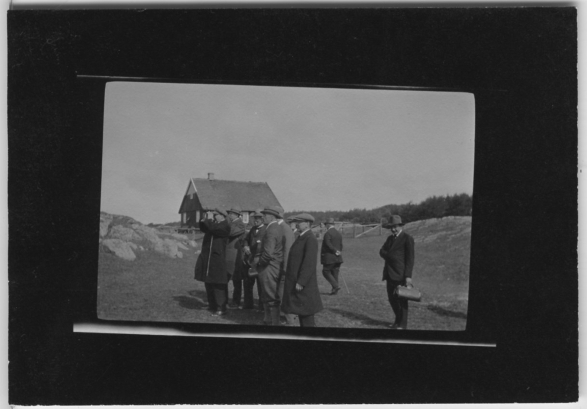 'Biologiska föreningens utfärd till Hallands Väderö: :: :: 9 män varav en tittar i kikare. I bakgrunden en stuga. Öppen gräsmark med berghällar. Kläder. Klädsel. Keps. Väska. :: :: Se fotonr. 1464 och 4311:1-58 från samma utfärd.'