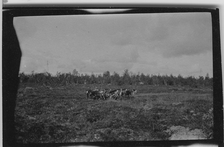 'Från Professor Leonard Axel Jägerskiölds ripjakter vid Fjällåsen. :: :: En renflock på ett öppet fält med låg skog i bakgrunden. :: :: Ingår i serie med fotonr. 4312:1-38.'