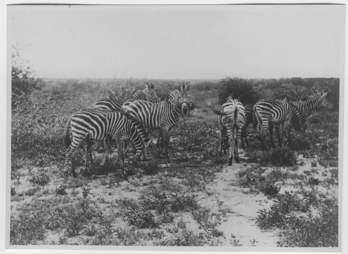 'ca 7 zebror i grupp, en del av dem med grimmor och rep. :: :: Ingår i serie med fotonr. 4337-4348.'