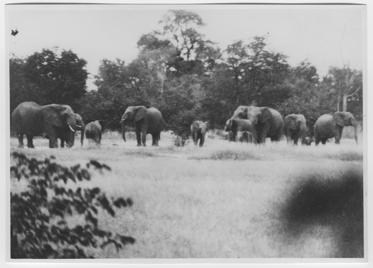 '10-tal elefanter i flock, några ungar. På öppen gräsmark med träd i bakgrunden. :: Ingår i serie med fotonr. 4337-4348.'
