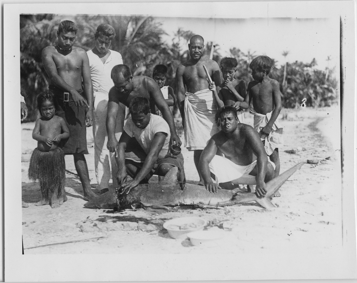 '6 män och 4 barn omger 1 haj liggandes på stranden. Huvudet bearbetas. Kläder. Klädsel. :: :: Ingår i serie med fotonr. 4352:1-7. Se även fotonr. fotonr. 4349-4351.'