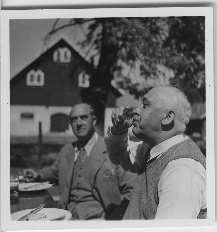 'Ingår serie 4385:1-27 från Biologiska föreningens utfärd till sjön Östen och Kinnekulle. :: :: 2 män till bords utomhus, den ena ifärd med att dricka, närbild. I bakgrunden är träd och byggnad synliga.'