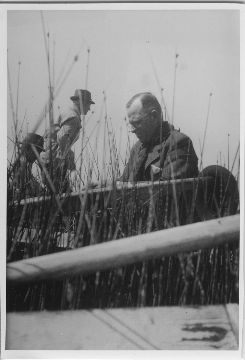 'Ingår serie 4385:1-27 från Biologiska föreningens utfärd till sjön Östen och Kinnekulle. :: :: 3 män i ekor i sjön Östen, sedda från kanten av en annan eka.'
