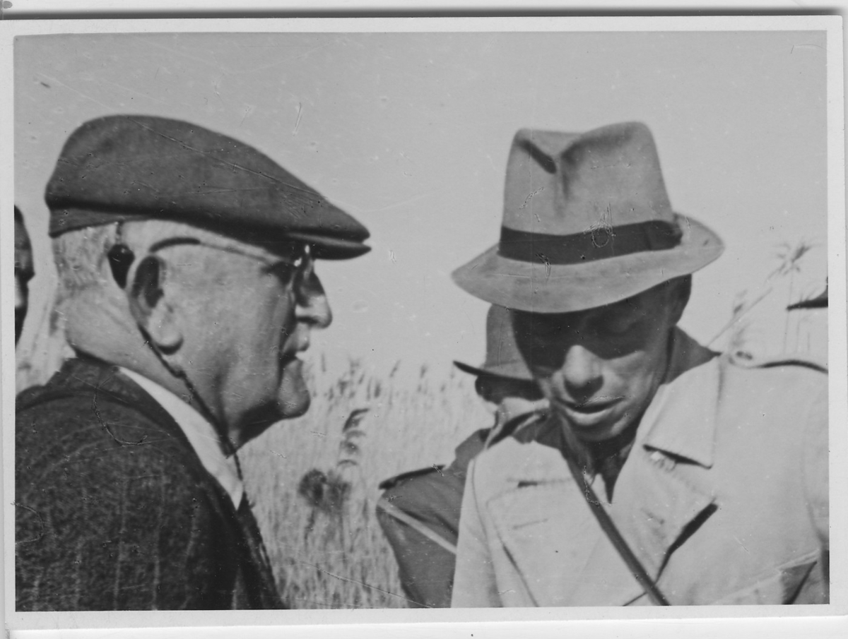 'Ingår serie 4385:1-27 från Biologiska föreningens utfärd till sjön Östen och Kinnekulle. :: :: I förgrunden Professor Leonard Axel Jägerskiöld (till vänster) och författaren Erik Rosenberg. I bakgrunden skymtar ytterligare 2 män. Kläder. Klädsel. Hatt.'