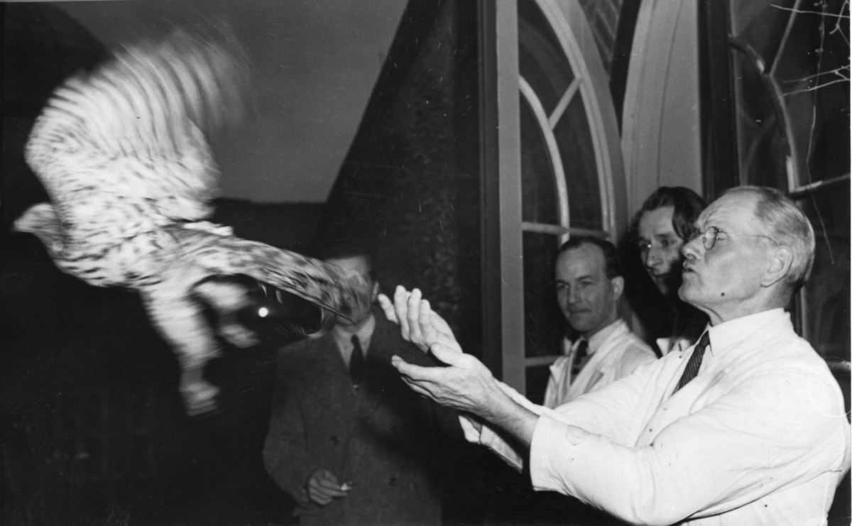 'Duvhöken flyger iväg från David Sjölanders hand, från ateljebalkongen. :: Det står 3 personer till på balkongen. Från vänster till höger: Konservator Enemyr, Viking Fontaine, Tom Skowgård och främst David Sjölander.'