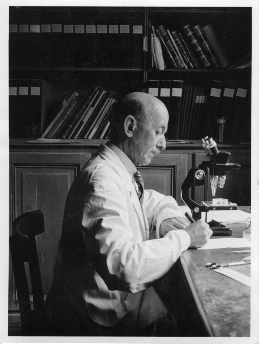 'Dr Knud Stephensen. Zooloogisk Museum. :: :: Vid arbetsbordet med mikroskop, fotograferad från sidan. I bakgrunden bokhylla med böcker. :: :: Ingår i serie med fotonr. 4486:1-5.'