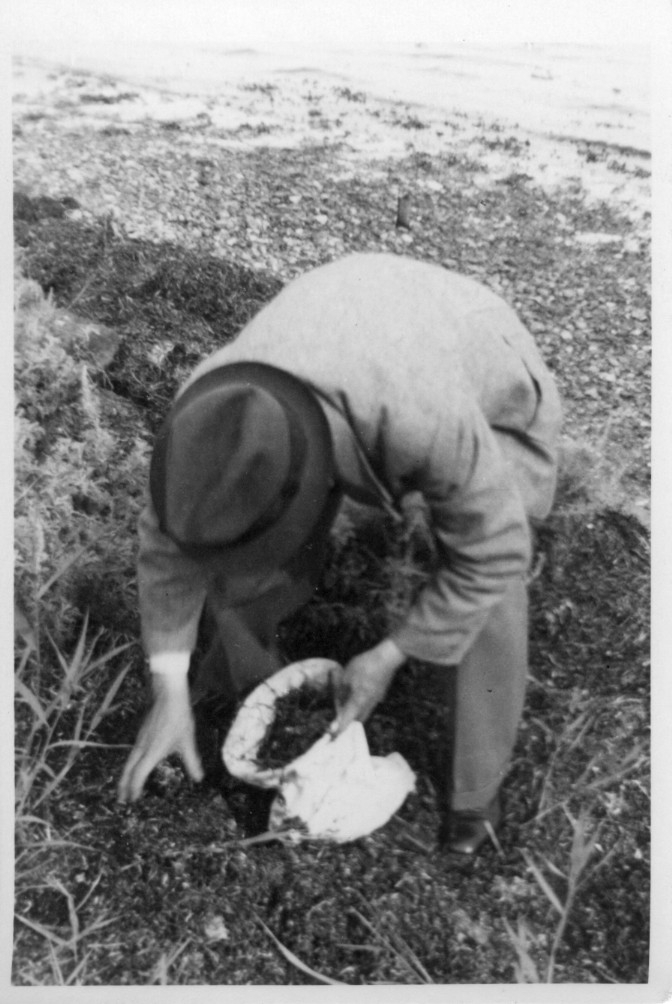 'Dr Knud Stephensen. Zooloogisk Museum, hattklädd. :: :: Samlar in jordprov. :: :: Ingår i serie med fotonr. 4486:1-5.'