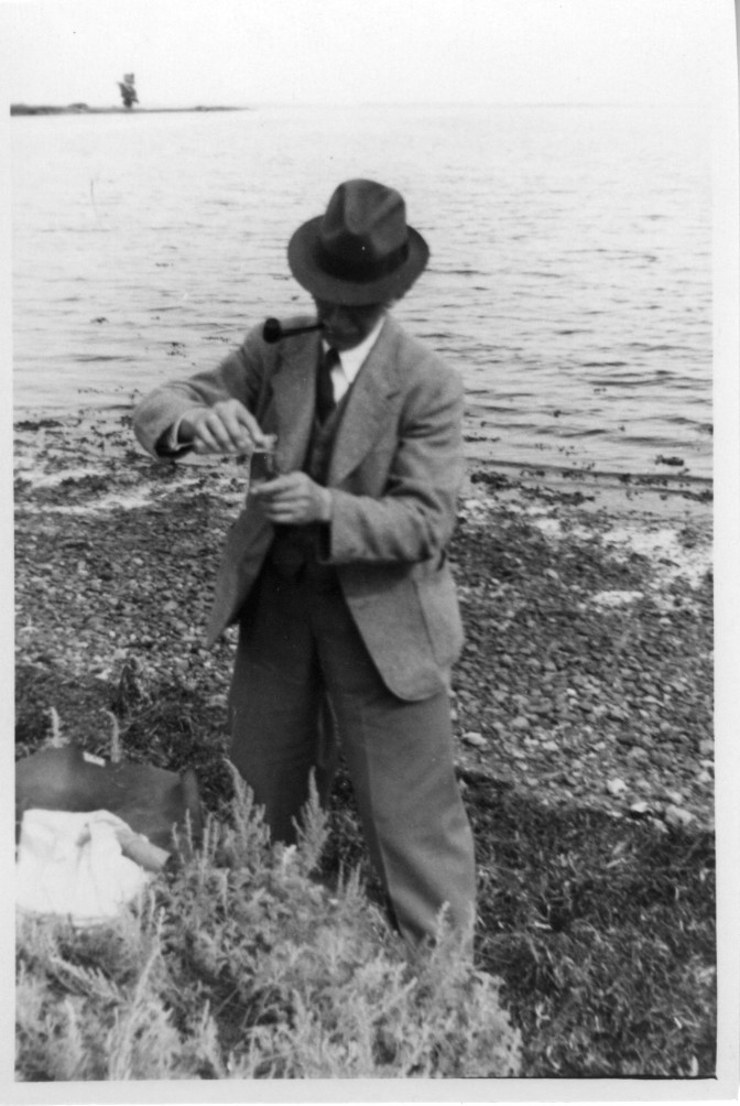 'Dr Knud Stephensen. Zooloogisk Museum, hattklädd. :: :: Stående med jordprover i en burk. I bakgrunden vy ut mot havet. :: :: Ingår i serie med fotonr. 4486:1-5.'