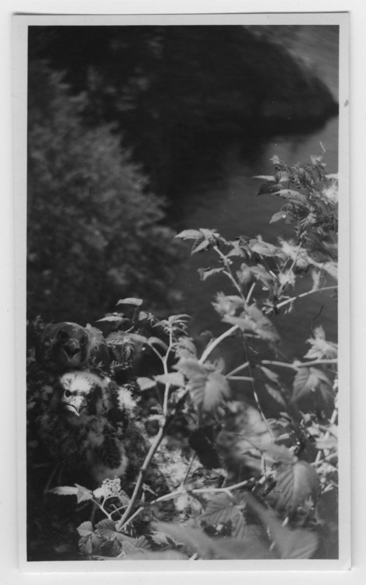 '2 st pilgrimsfalkar, hona och hane, synliga invid hallonbuske. :: :: Text på baksidan av fotot: ''Hannen och honan skrika mot kameran gömda bakom hallonbusken. Den äldre hannen flög ut från boet och satte sig i ett träd nere i hultet då jag kom ner i boet. Fotot taget med 90 cm linsen.'' :: :: Ingår i serie med fotonr. 4500:1-172.'