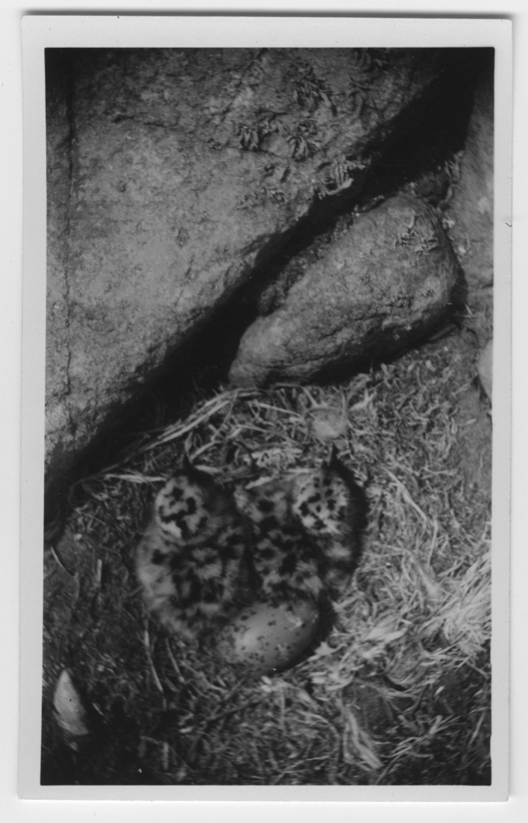 'Bo med 1 ägg och 2 st ungar av fiskmås. :: :: Text på baksidan av fotot: ''2 ca 1 timme gamla fiskmåsungar vid det ännu inte kläckta ägget i en bergskreva på en udde.'' :: :: Ingår i serie med fotonr. 4500:1-172.'